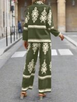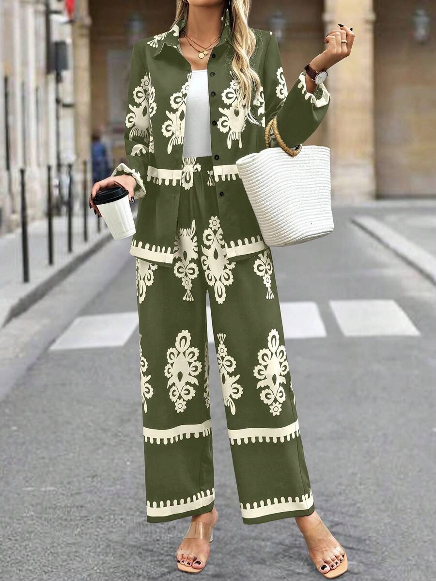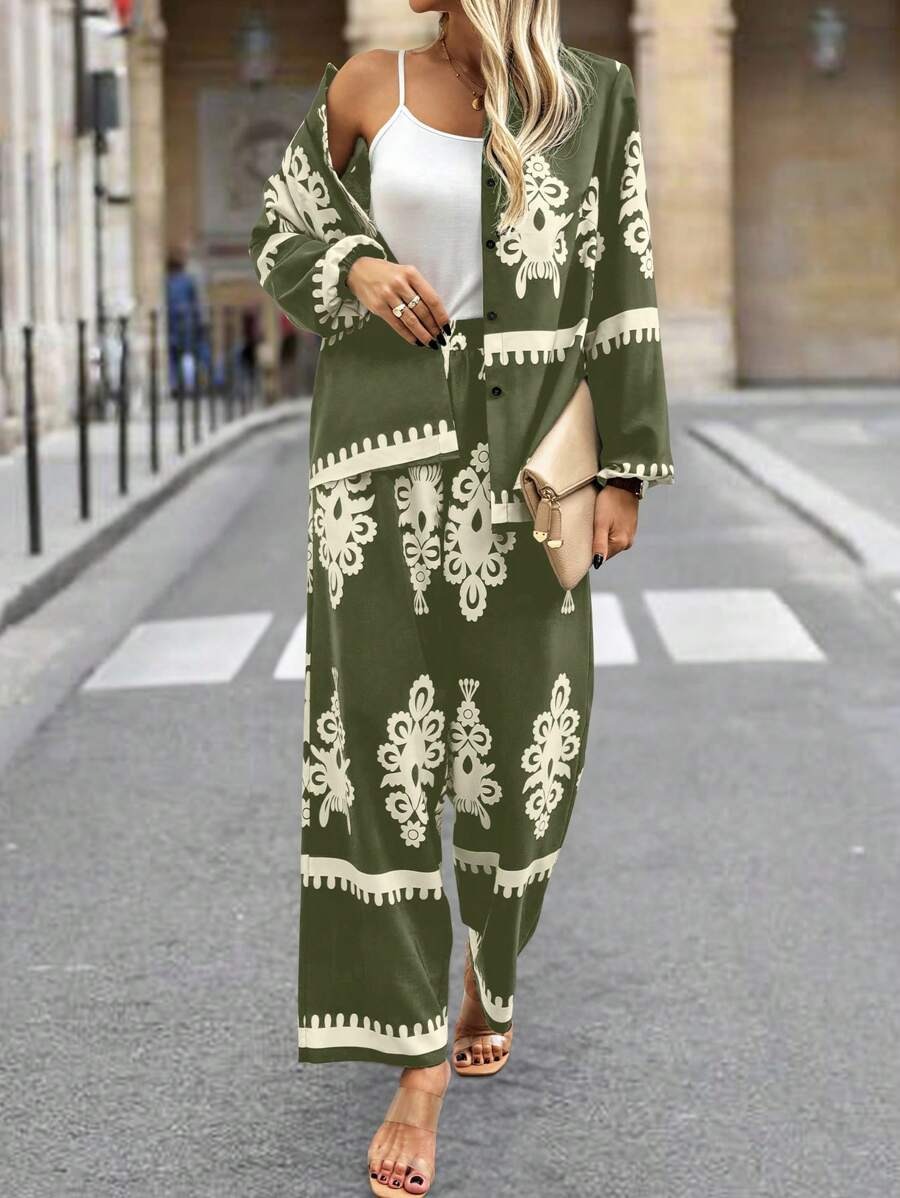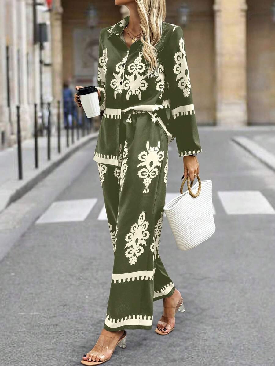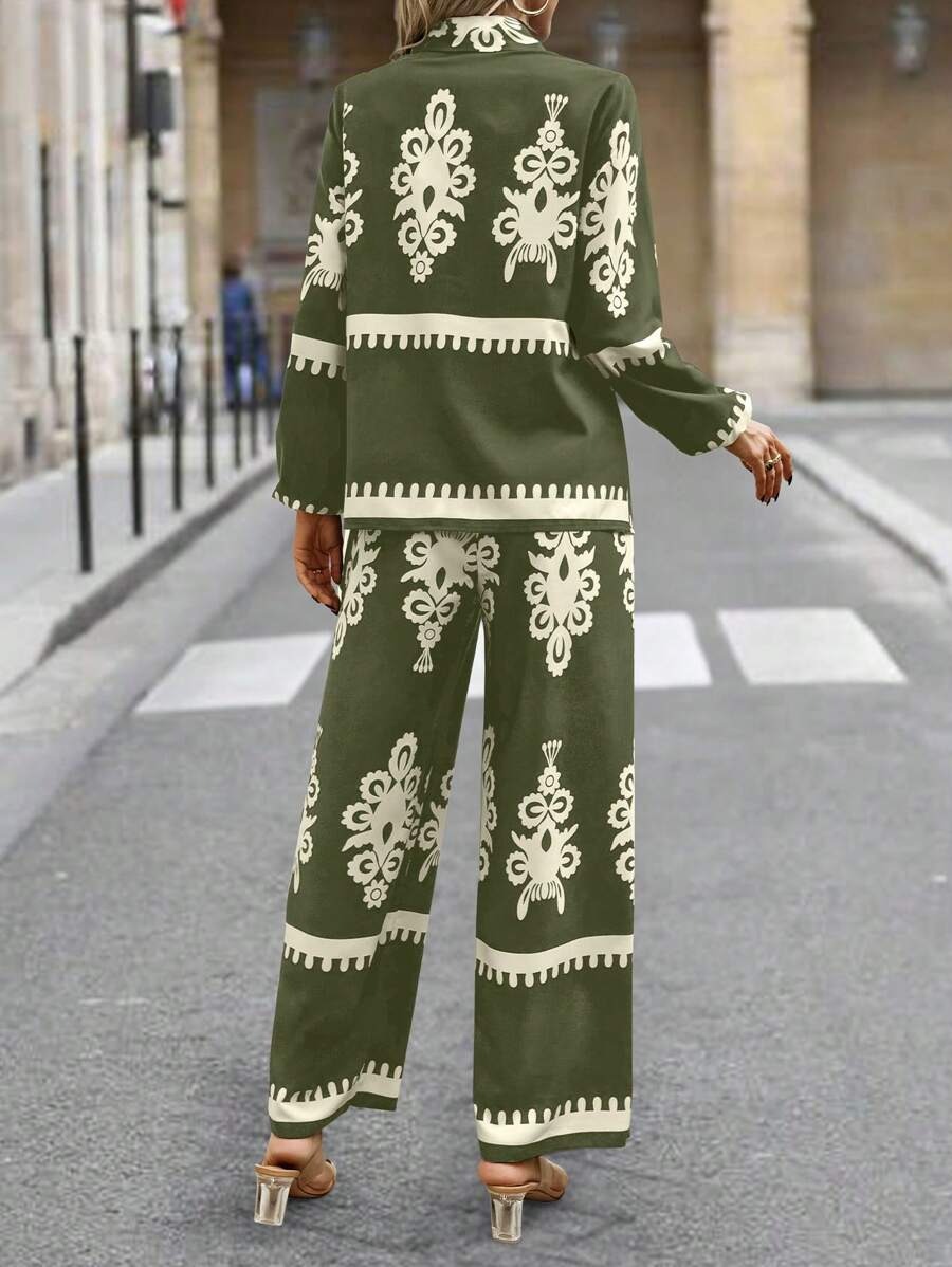 2pcs Elegant Special Set for Women with Random Print Front Button Long Sleeve Top and Pants Casual Suit – Army Green