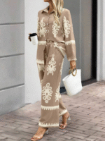 2pcs Elegant Special Set for Women with Random Print Front Button Long Sleeve Top and Pants Casual Suit – Khaki