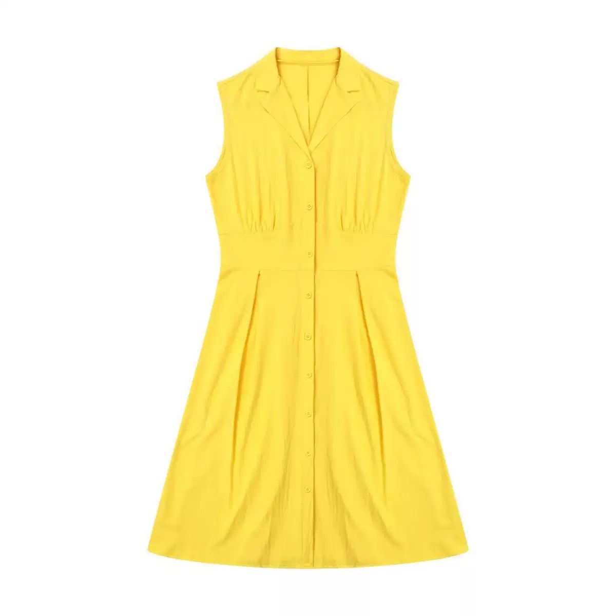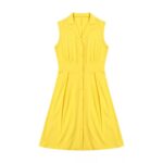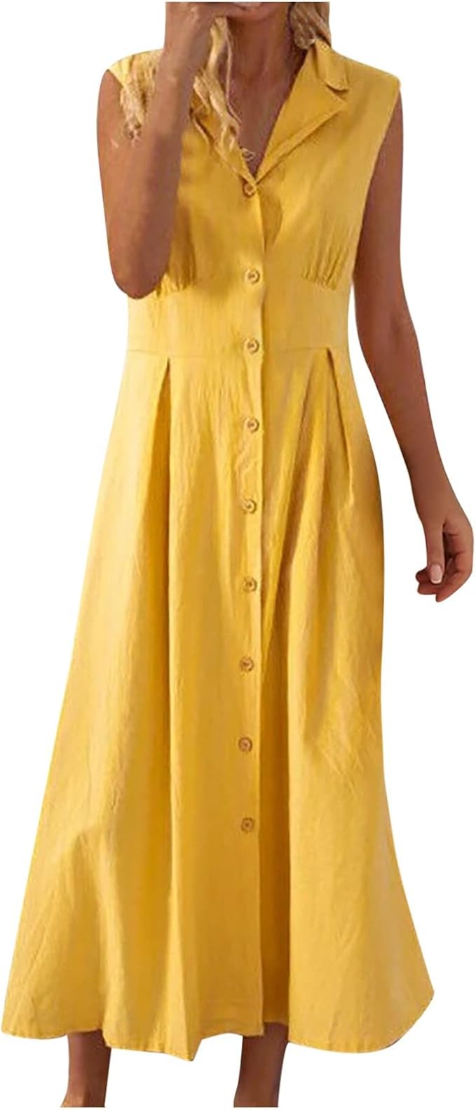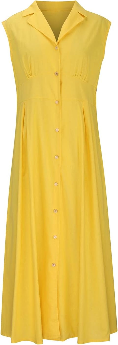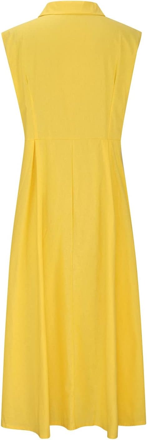 Adhdyuud Women’s Casual Loose Sleeveless Lapel Shirt Dress Solid V-Neck Single Breasted Office Dresses -yellow