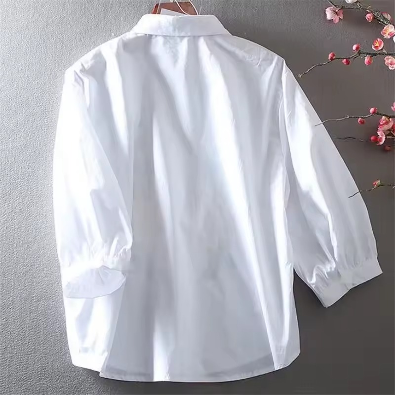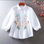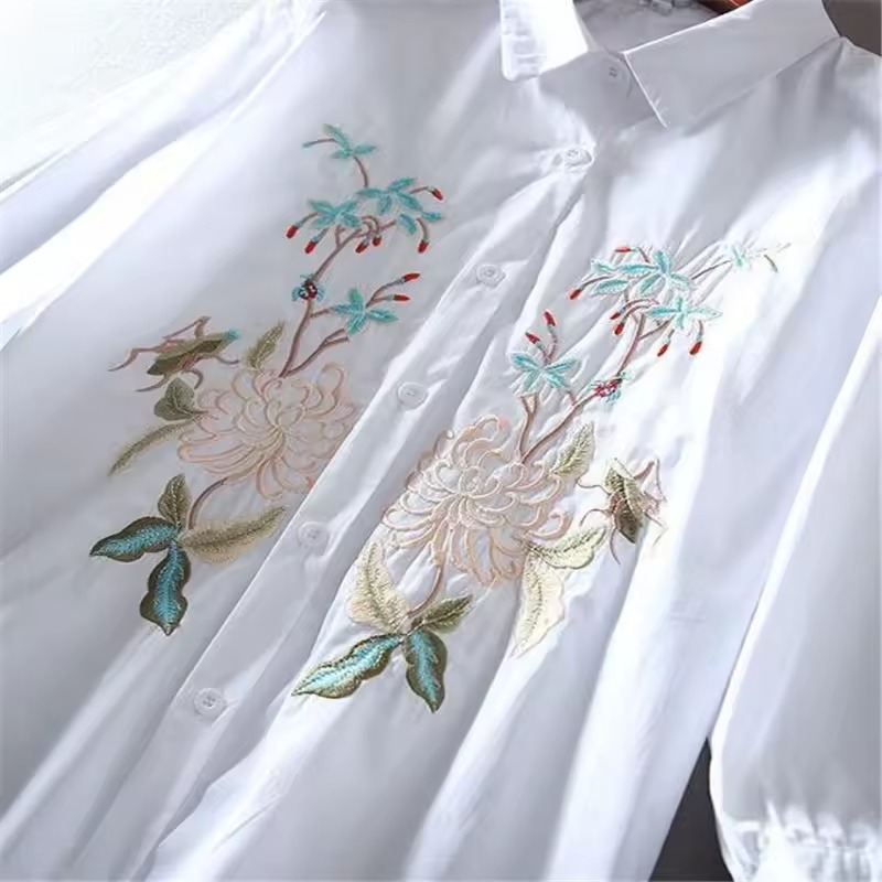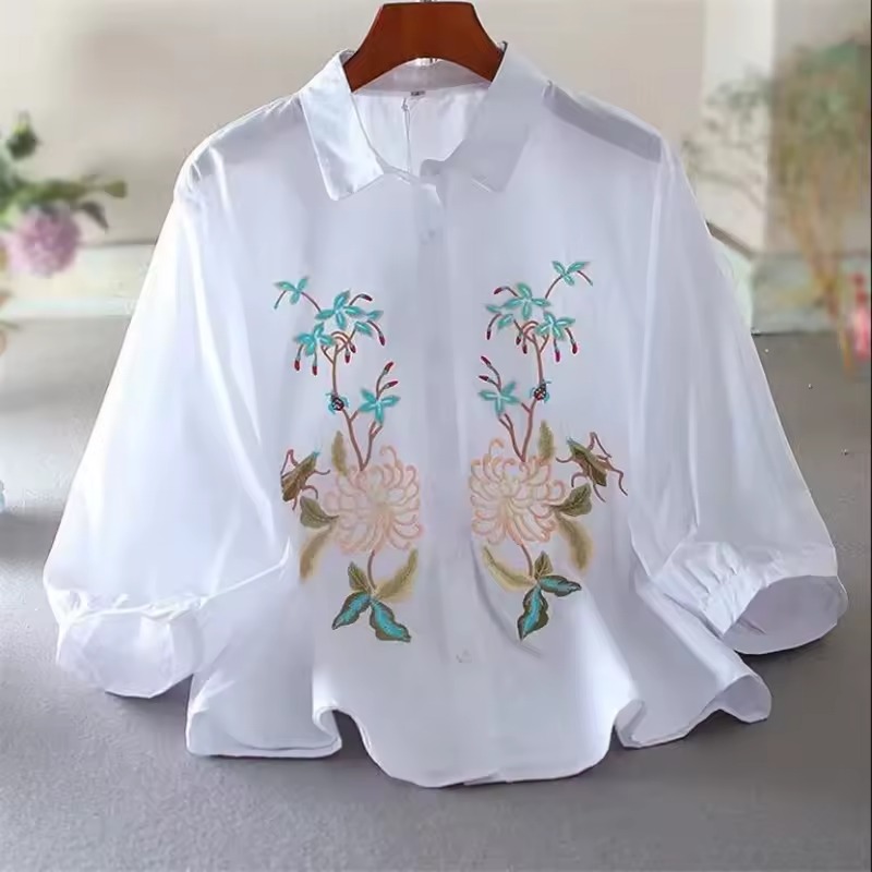 Butterfly Embroidered Lapel Neck Blouse, YOUNG Button Front Long Sleeve Blouse For Spring & Summer, Women’s Clothing -WHITE