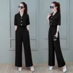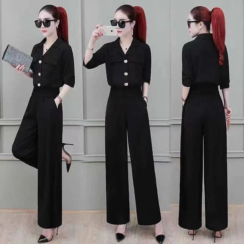 Elegant Summer New Modern Professional Suit Slimming Cropped Top Wide Leg Straight Leg Pants 2 Piece Set Women Fashion