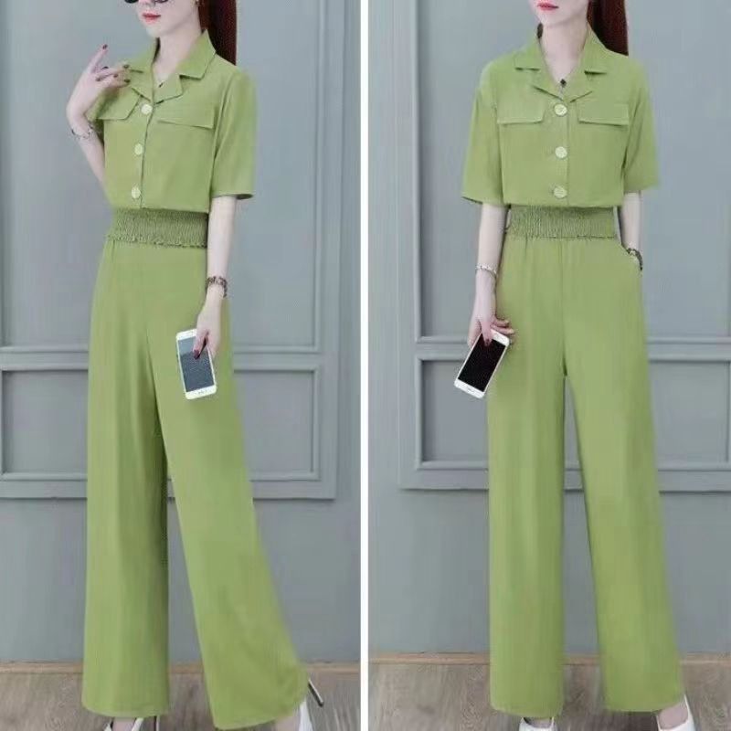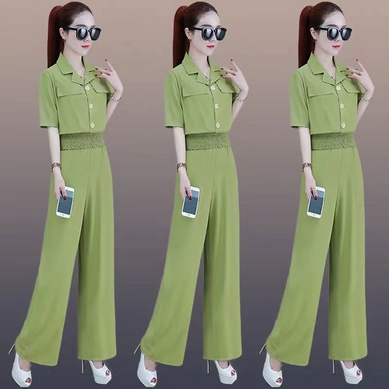 Elegant Summer New Modern Professional Suit Slimming Cropped Top Wide Leg Straight Leg Pants 2 Piece Set Women Fashion