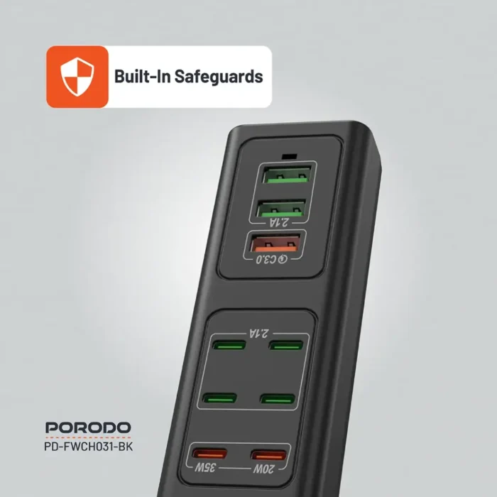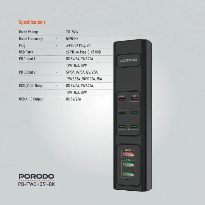 The Porodo 85W Multi-Port USB Charging Hub is an efficient, powerful charger that was made for all needs regarding devices. Equipped with a 3-pin UK plug, this operates at a voltage of 110-240V and a frequency of 50/60Hz for compatibility in most countries around the world. The charging hub comes with as many as nine USB ports: two PD, four Type-C, and three USB-A for solid options for fast and simultaneous charging. It supports PD Output 1 up to 20W and PD Output 2 up to 35W to provide optimal power to the power-hungry device. Besides that, the USB QC 3.0 output supports quick charging of up to 20W to meet your swift recharge needs. The Porodo 85W Charging Hub features a 2-meter cable with built-in safeguards for overcharging. Ultimately, it’s perfect for anyone who seeks performance and convenience in a tiny device.