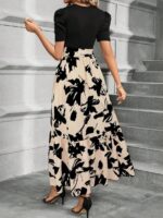 Elegant Floral Print A-Line Dress - Off-Shoulder/One-Shoulder with Adjustable Side Ties, Black & Golden