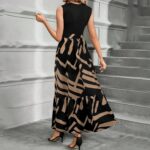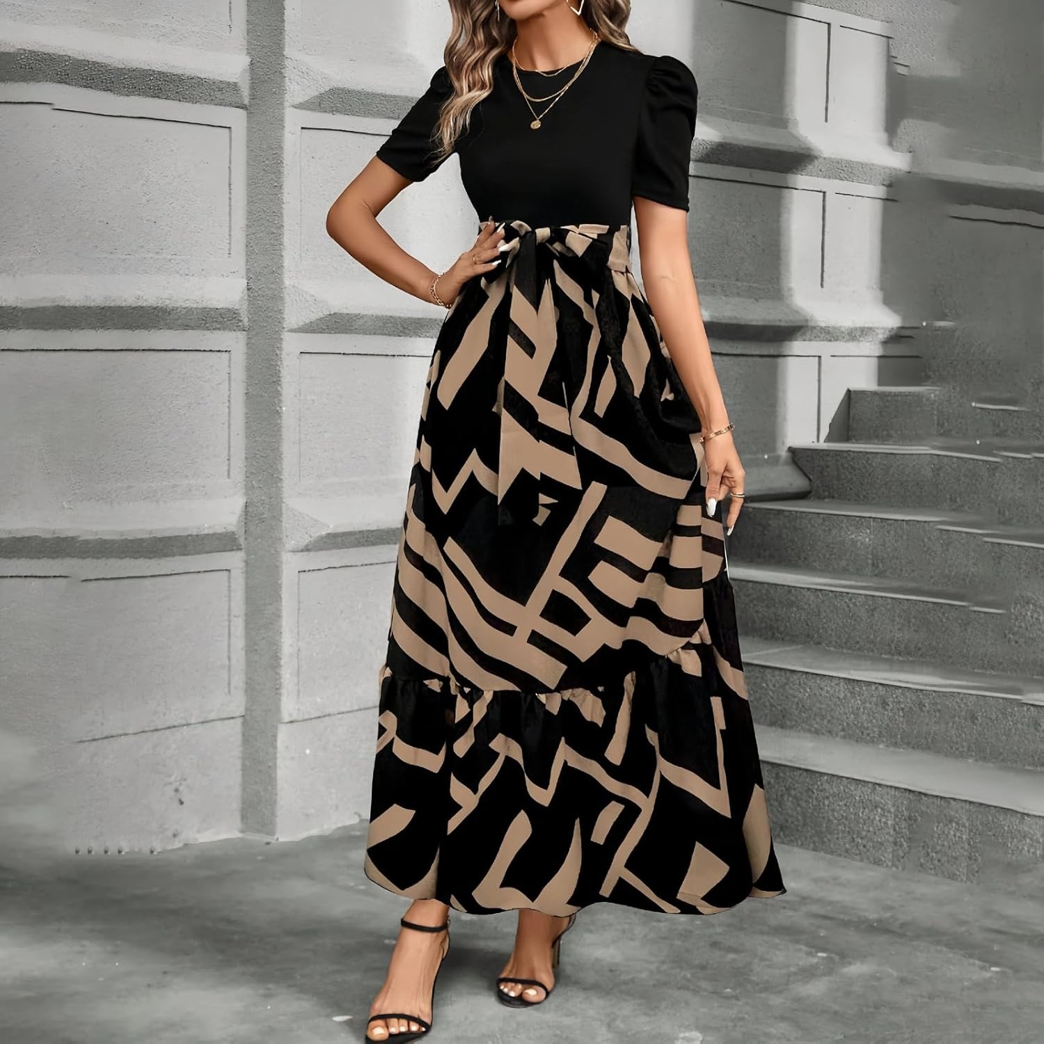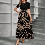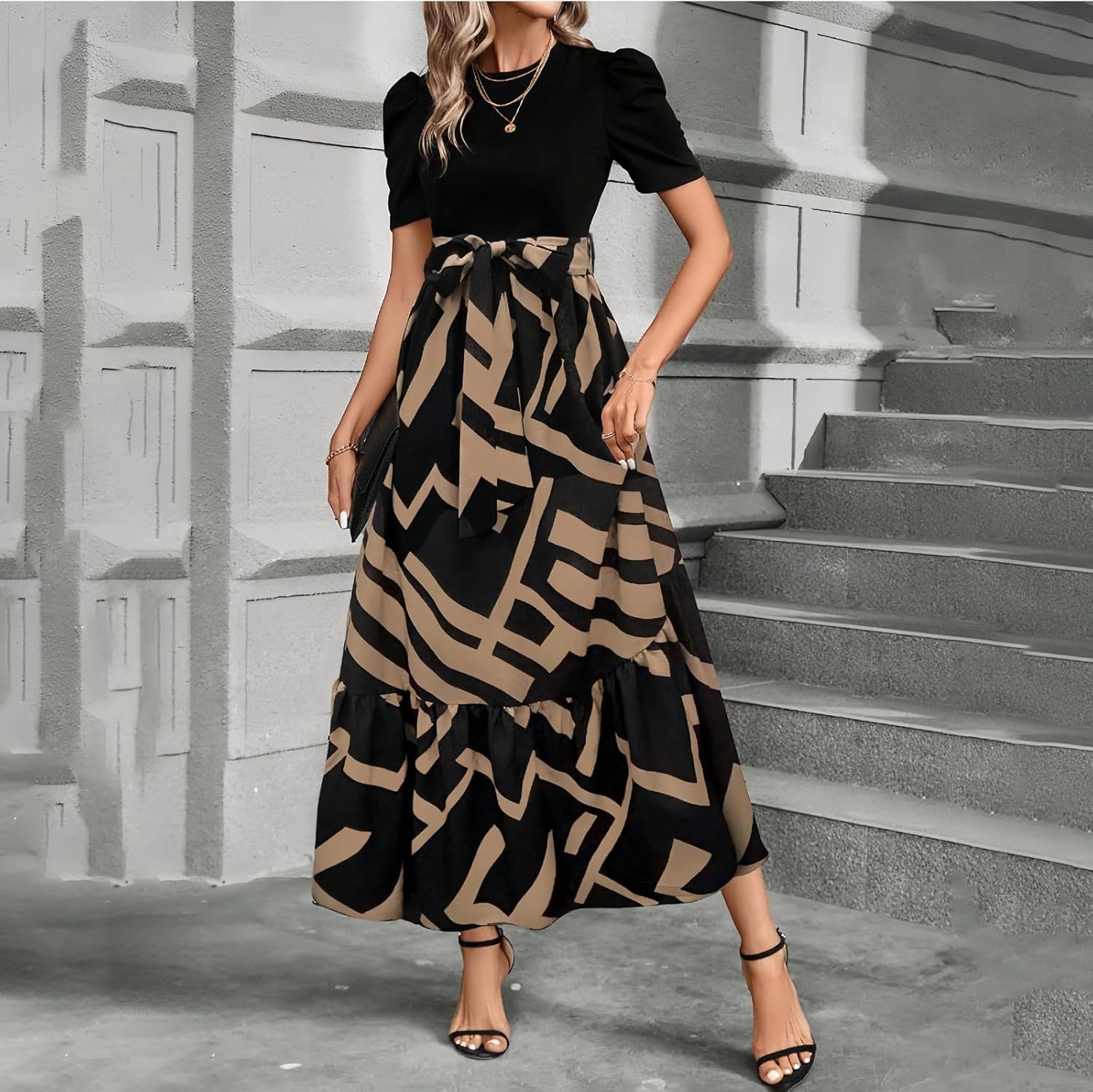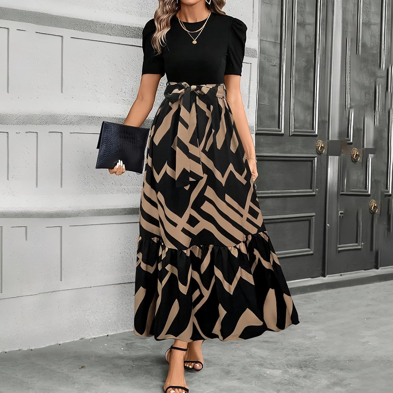 Women’s Elegant A-Line Dress with Directional Print & Adjustable Waist Belt – Round Neck, Machine Washable – Plaid Coffee