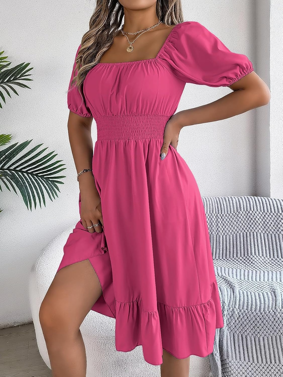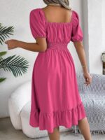 Women’s Plain Square Neck Short Sleeve Flare Peplum Dress, High Waist Elegant Casual Dress – rose red