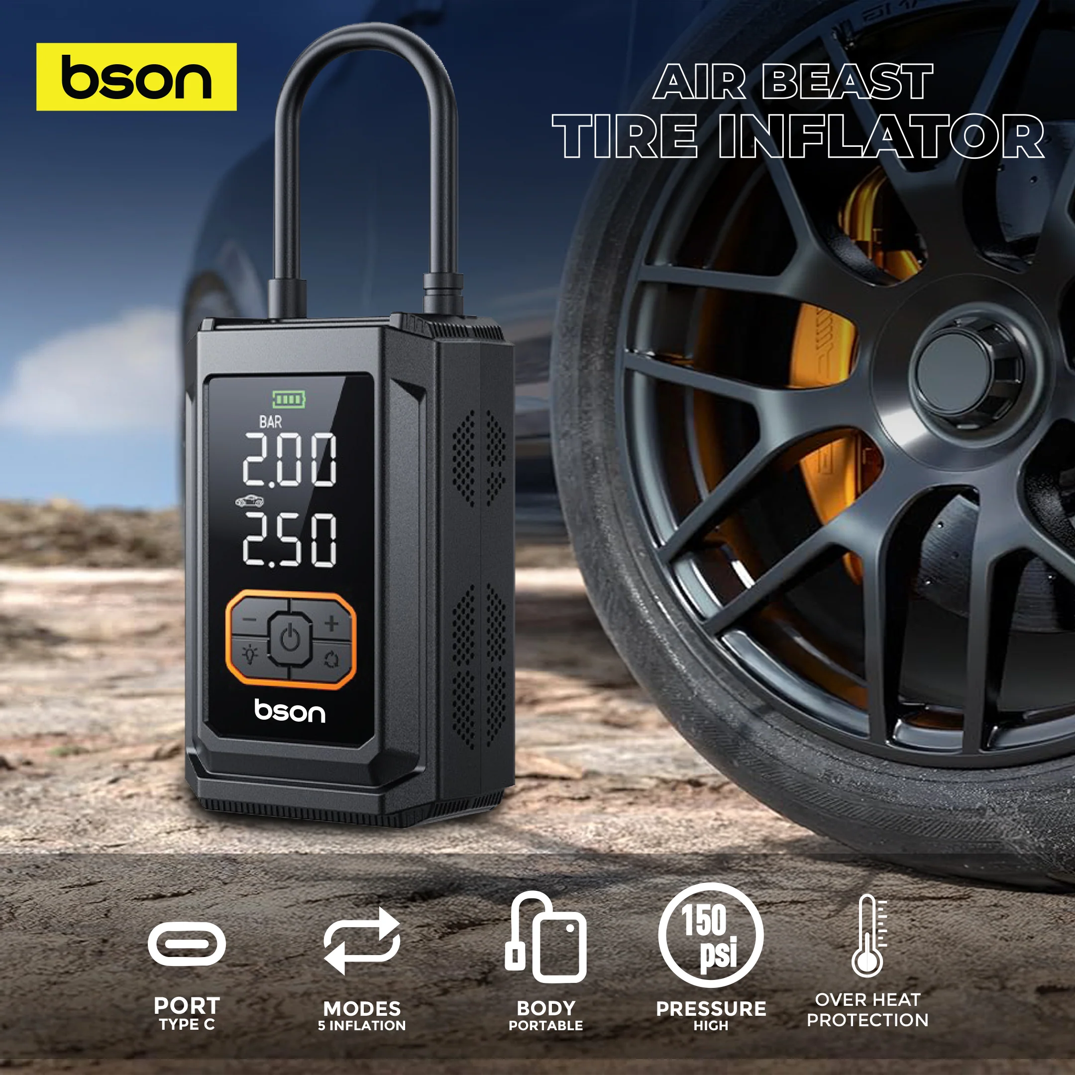Bson Air Beast 4-in-1 Tire Inflator – 150 PSI power with fast inflation, 5 smart modes, air pressure monitoring, large digital display, heat protection, built-in LED flashlight & power bank. Ideal for cars, bikes, balls, and outdoor emergencies