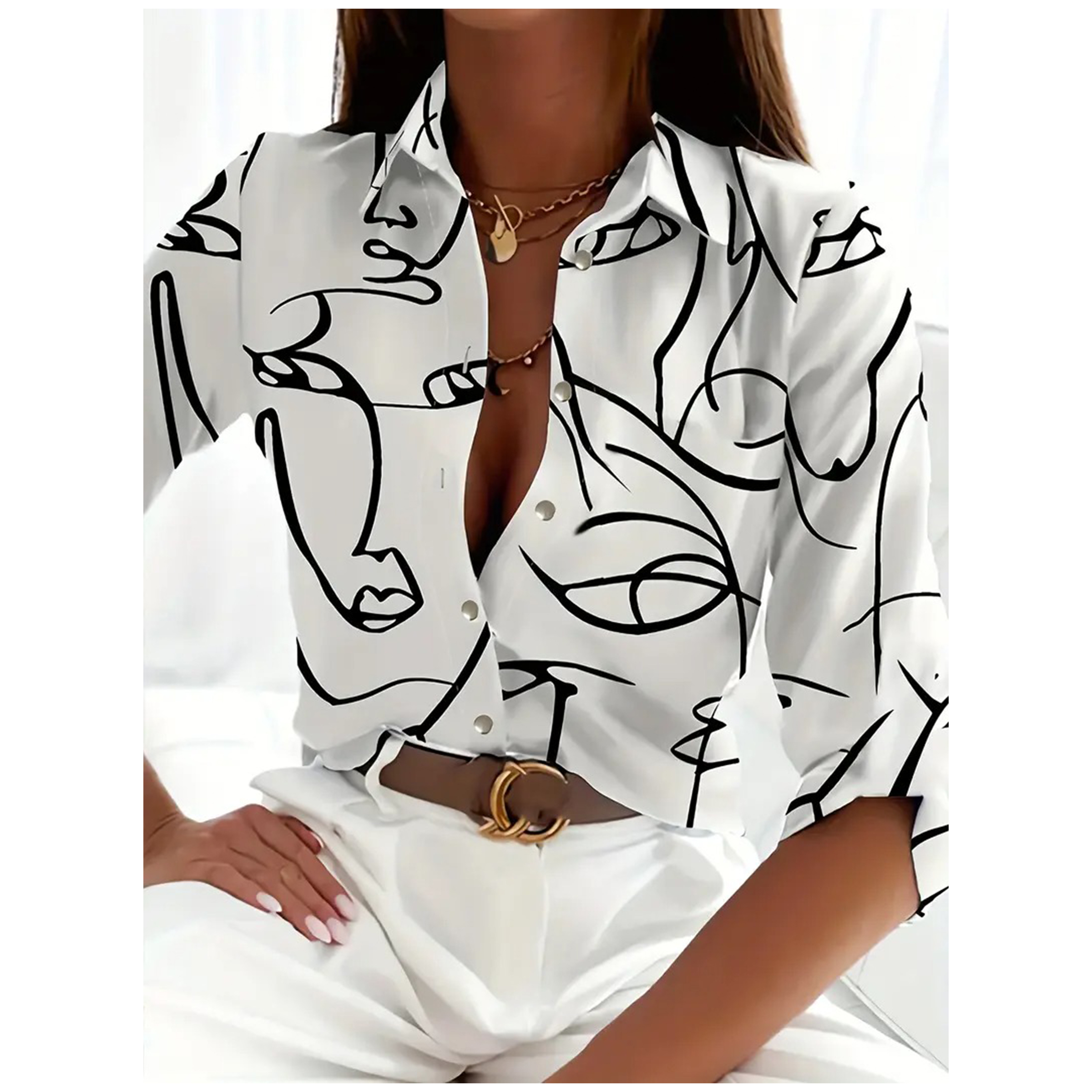 Step into effortless style with the Women’s Casual Long Sleeve Button-Up Shirt Qatar. This artistic top features a white base with black abstract face print, a pointed collar, and long sleeves, making it a standout piece for spring, summer, and fall fashion.