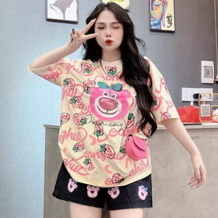 Sweet Cute Strawberry Bear Suit Women’s Summer New Loose pink Short Sleeve Shorts Casual Two-piece Set