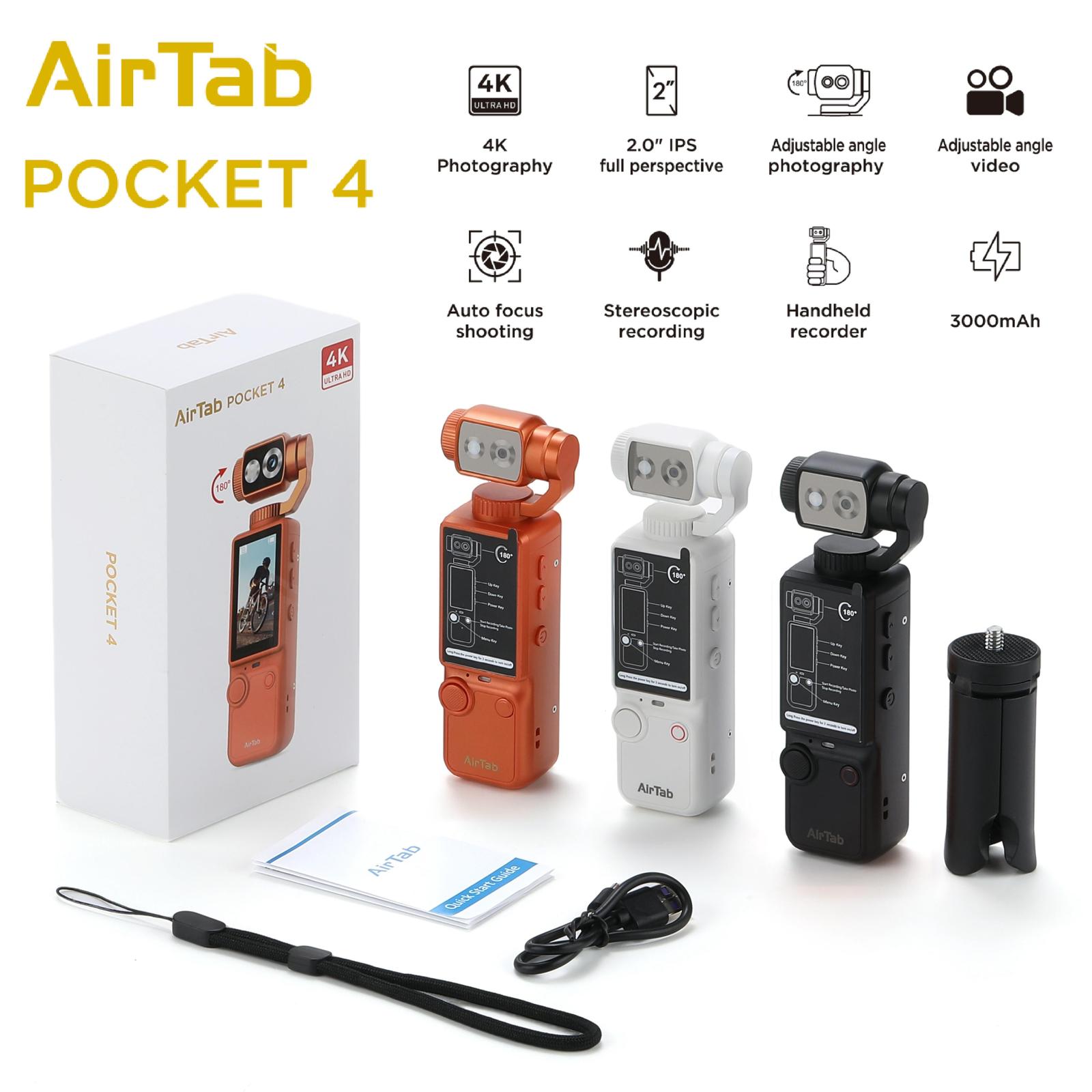 The Air Tab Pocket 4K Ultra HD Action Camera is a compact and durable camera designed for vlogging, travel, cycling, and outdoor sports. Featuring a 180° manual flip lens, 5MP camera, built-in fill light, long battery life, and complete accessories including 32GB card, tripod, wrist strap, and data cable.